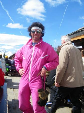 My outfit is RED. The sales associate pulls out a pair of skis for me. They are PINK. My eyes hurt looking at them next to my jacket. I decide I can suck it up for a day and who knows, maybe I’ll want the skis and I’ll have to start wearing head to toe pink. I’m not opposed.