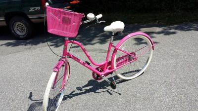 Three hours of traffic and several bathroom stops (for me) later, we drive away with a very pink bike in the back of a very manly truck. I clutch my pink bike basket and thank my boyfriend over and over again. He tells me,