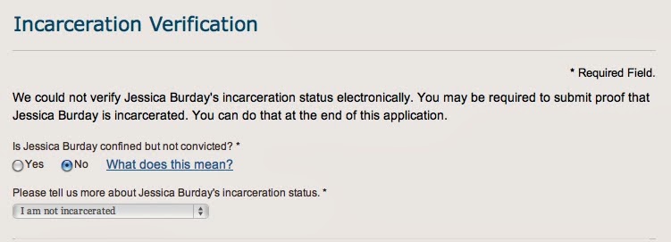 I examine the incarceration question. Yes it asks ‘Are you incarcerated?’ and I make a point to click NO.