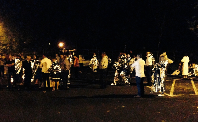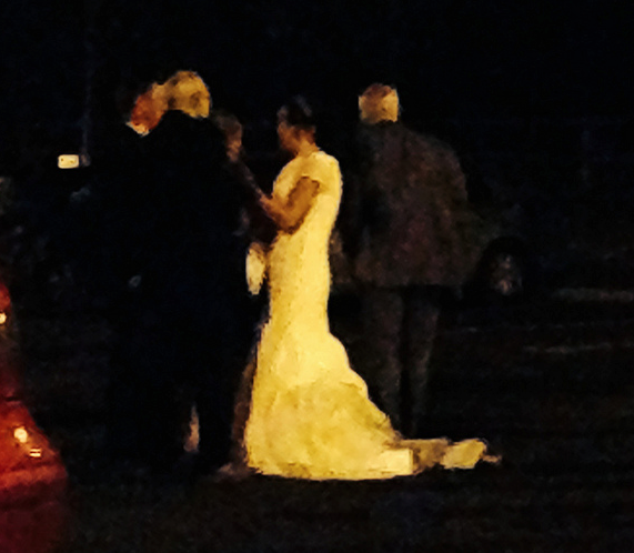 There’s an old woman in a wheelchair at the top of the stairs. A hotel employee comes to help her. This seems to be getting more real. We’re directed to an area of the parking lot. There are people in all stages of dress: suits, jammies, bathrobes and one woman in a wedding dress. Almost every other person has a drink in their hand.