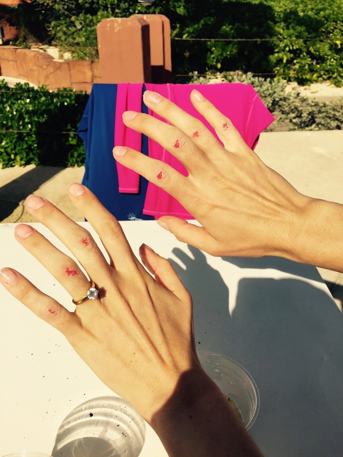 I’m so excited. I run ahead of Captain, jump in the lazy river, dive under the water and take a big swim stroke. OW!!! My hands scrape the bottom HARD. I pull them out and stare at them. They’re not bleeding. One second. Two seconds. The blood starts.