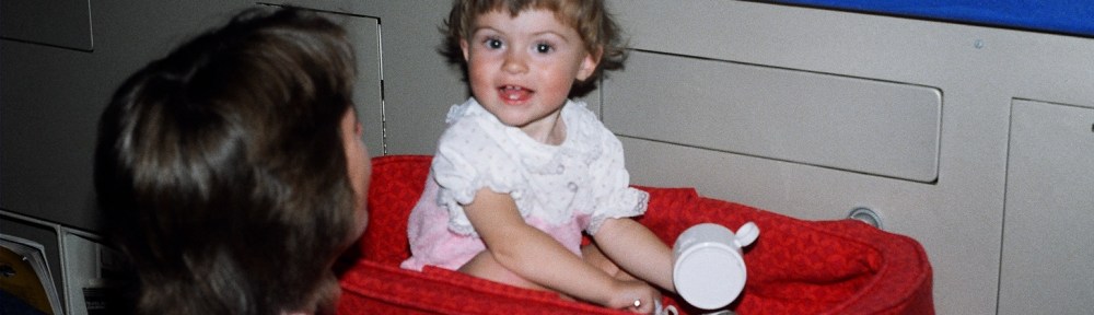 Halfway through the flight Baby Bop is asleep in her carrier. I’m standing with her in the aisle. I’ll sit when the seatbelt sign comes back on or when my legs give out. An older woman approaches. I slip into my row to allow her to pass. She asks,